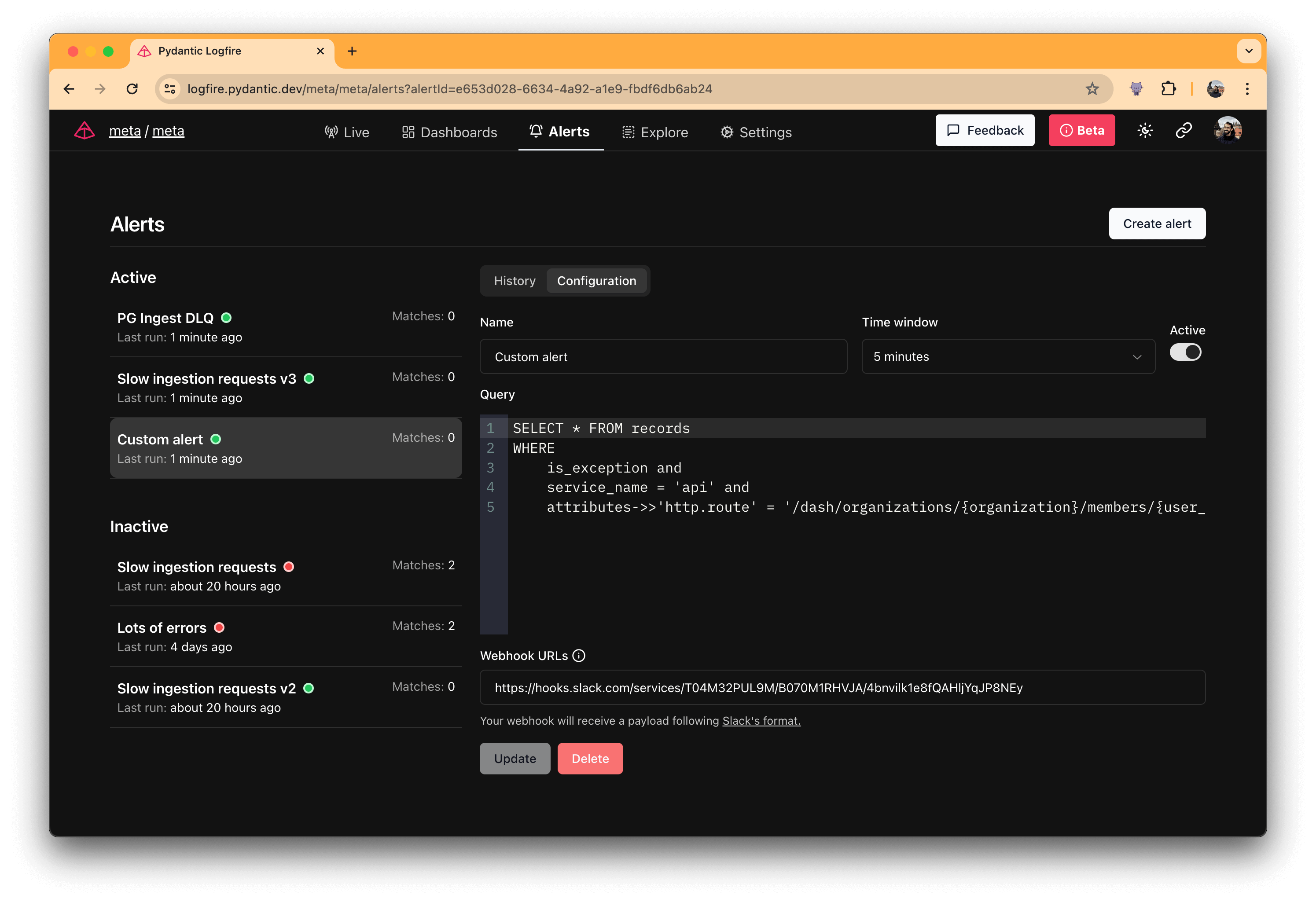 With Logfire, you can set up alerts to notify you when certain conditions are met.