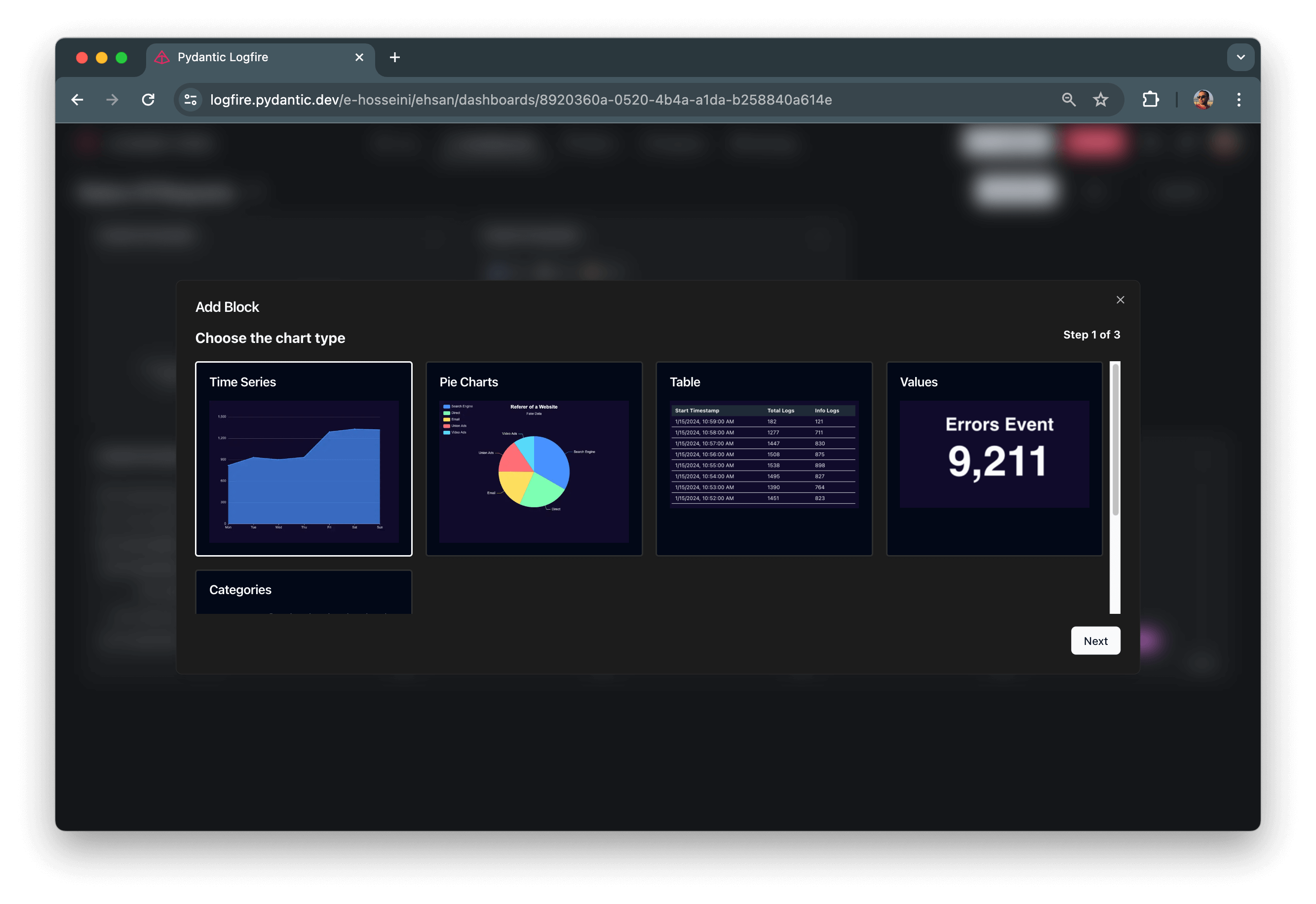 When creating a custom dashboard or modifying them in Logfire, you can choose from different chart types to visualize your data.