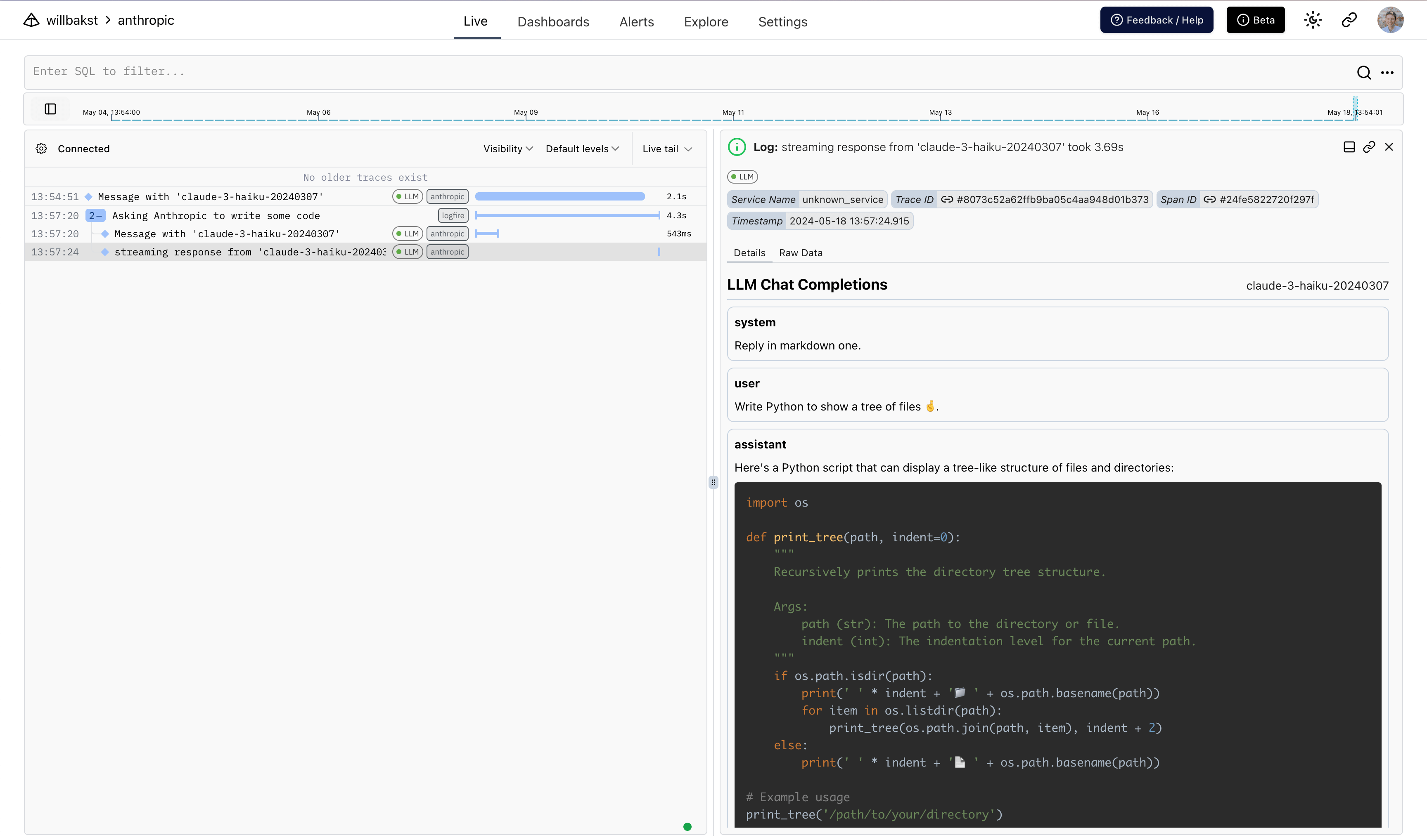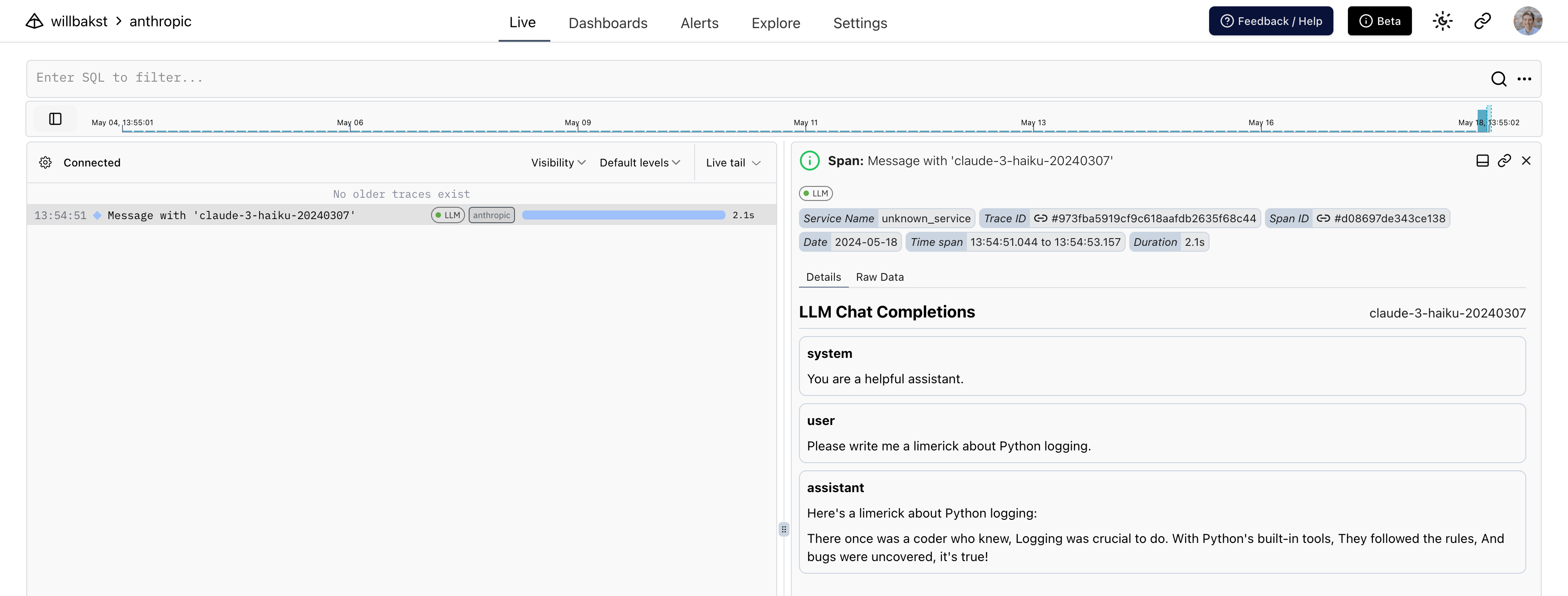 - a span around the call to Anthropic which records duration and captures any exceptions that might occur
